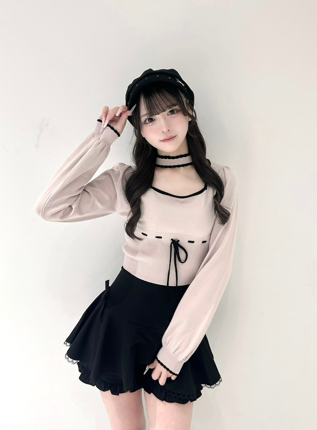 チョーカー付きバイカラーリボンニット