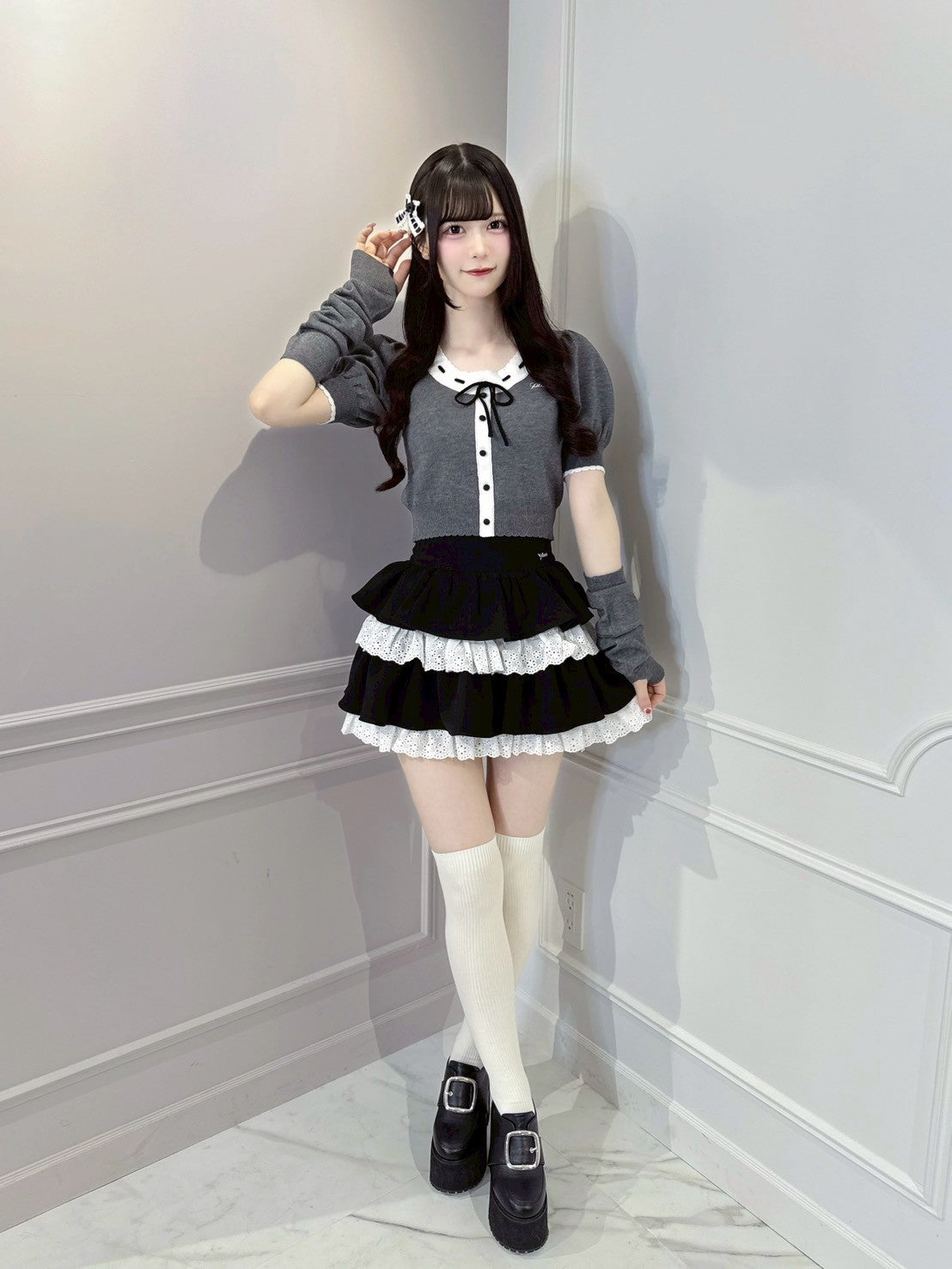 アームウォーマー付きバイカラーリボンニット